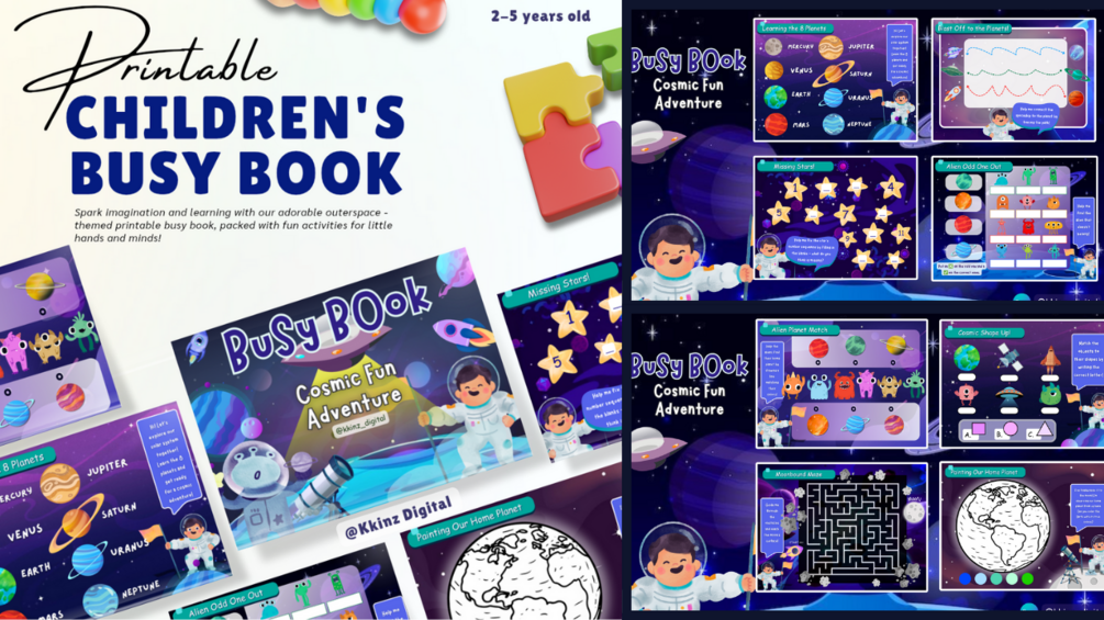 Spark imagination and learning with our adorable outerspace -themed printable busy book, up to 11 pages packed with fun activities for little hands and minds! Ideal for Toddlers & Preschoolers!